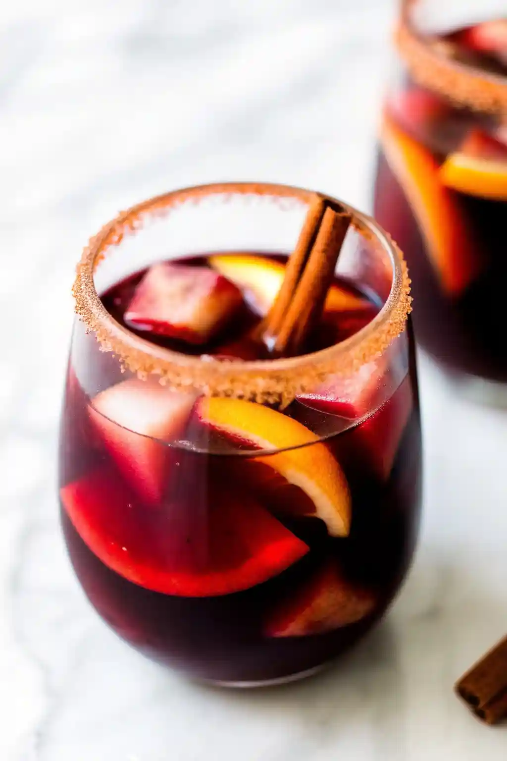 - Serve this apple cider sangria in large wine glasses to show off the beautiful fruit. Make sure each glass gets a few pieces of the booze-soaked fruit from the pitcher. For an extra touch, garnish each glass with a fresh, thin apple slice and a cinnamon stick.