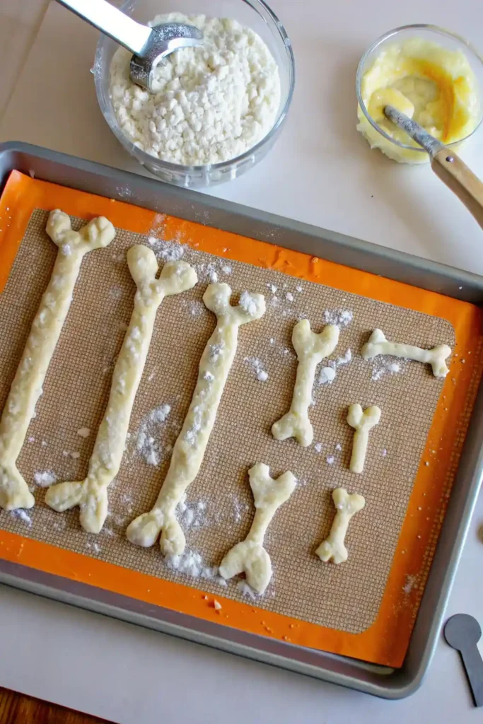 5. Shape the Bones: Place the wrapped cheese stick on the prepared baking sheet. Use scissors or a small knife to cut a 1-inch slit into each end. Gently pull apart and shape the cut ends to resemble the knobs of a bone. Repeat with the remaining dough strips and cheese sticks, placing them about 2 inches apart on the baking sheet.