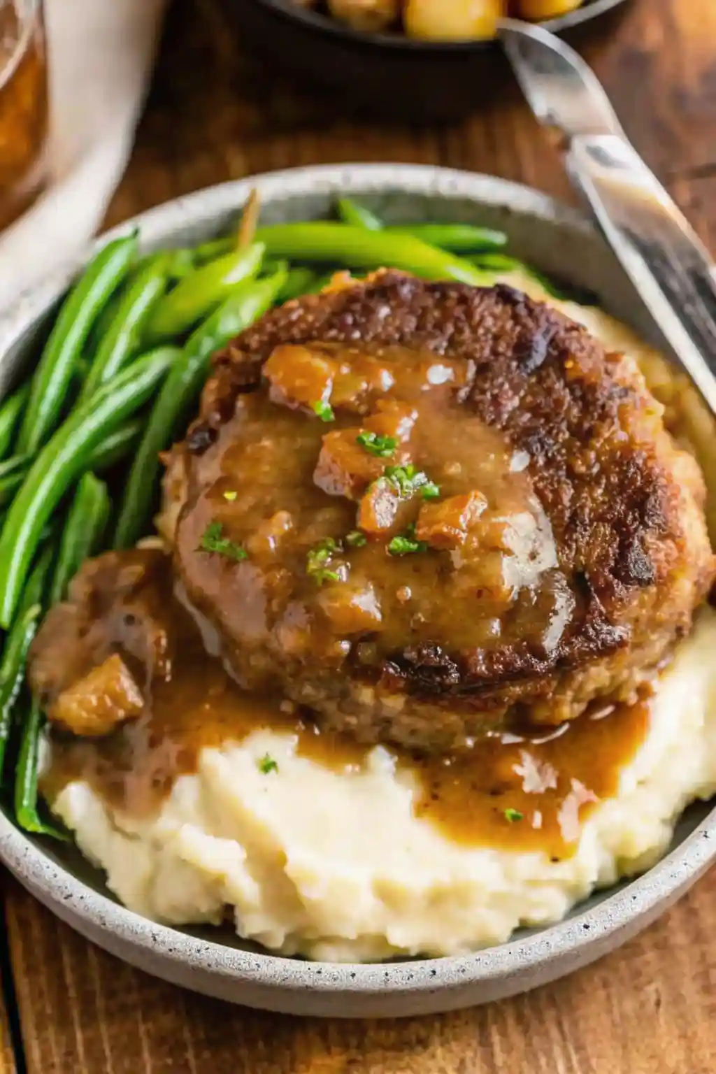 - Serve: Serve the Salisbury steaks and gravy hot over the creamy mashed potatoes. Garnish with fresh parsley if desired.