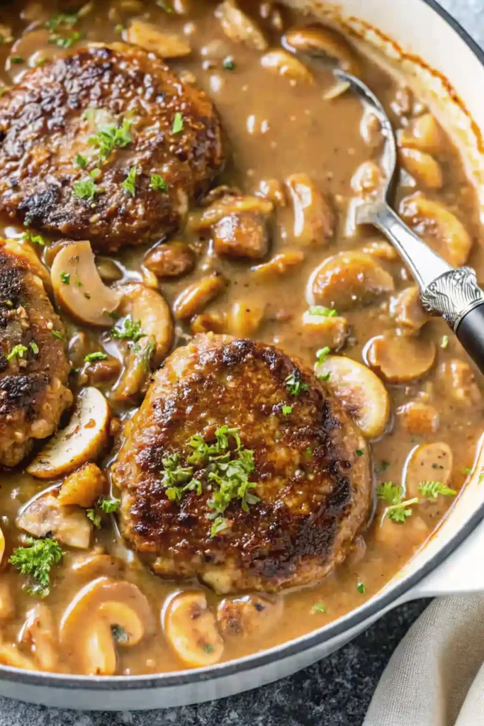 - Simmer: Bring the gravy to a simmer. Return the seared patties to the skillet. Reduce the heat to low, cover, and let them simmer gently in the gravy for 15-20 minutes, or until cooked through.