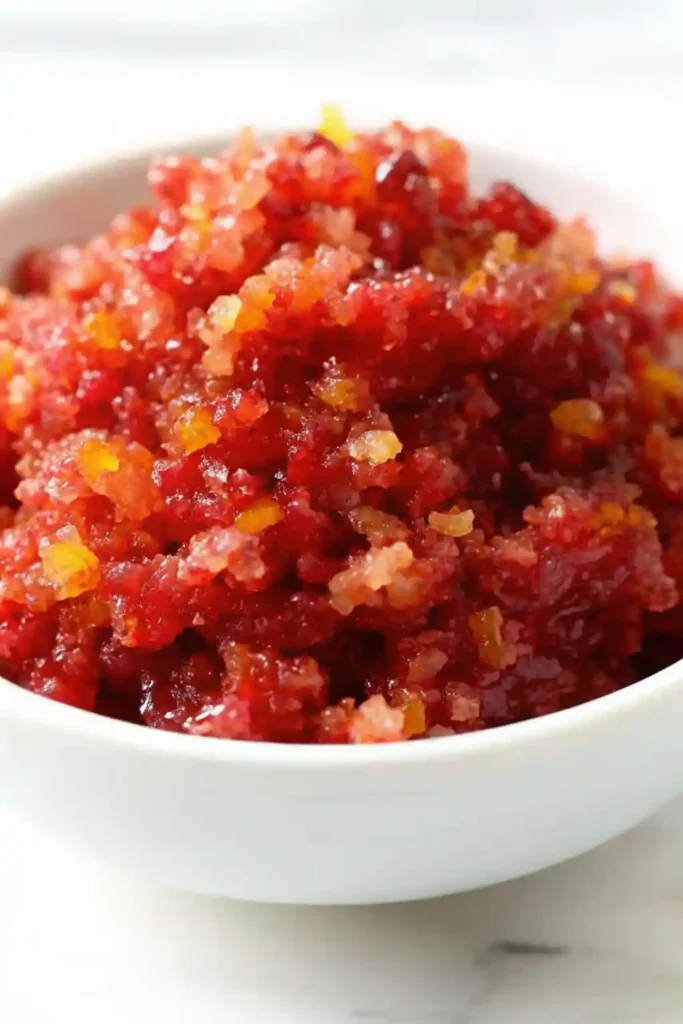 You want a coarsely chopped, relish-like texture—not a smooth puree. The cranberries should be broken down, but you should still see distinct pieces of fruit. Think “chunky salsa” consistency.