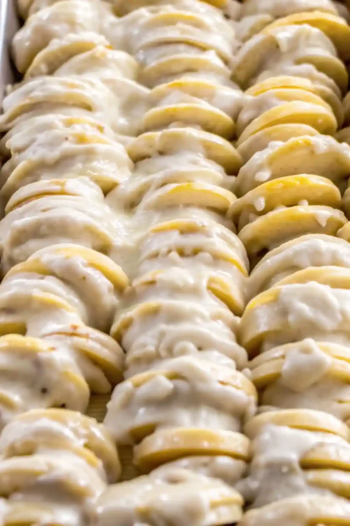 - Layer the Dish: Arrange half of the sliced potatoes in an even, overlapping layer in the bottom of the prepared baking dish. Pour half of the cheese sauce over the potatoes.