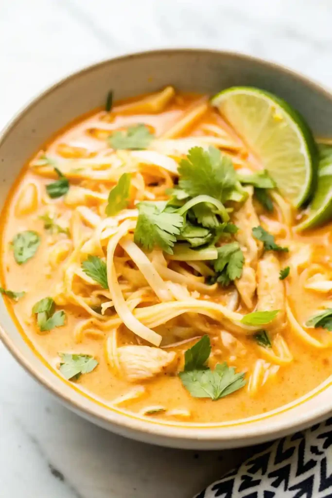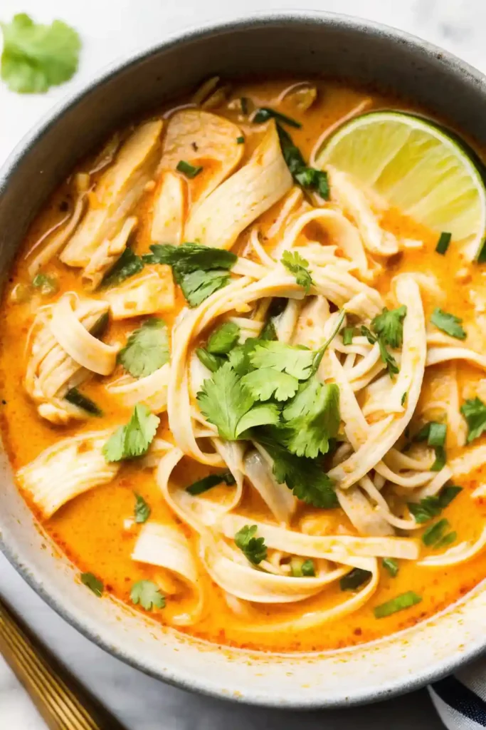 This Creamy Thai Chicken Curry Soup is a vibrant, soul-warming bowl of comfort that tastes like it came from your favorite Thai restaurant, but is ready in just 30 minutes. It features tender pieces of chicken and rice noodles swimming in a rich, fragrant broth made from coconut milk, red curry paste, and a perfect balance of sweet, savory, and spicy flavors.