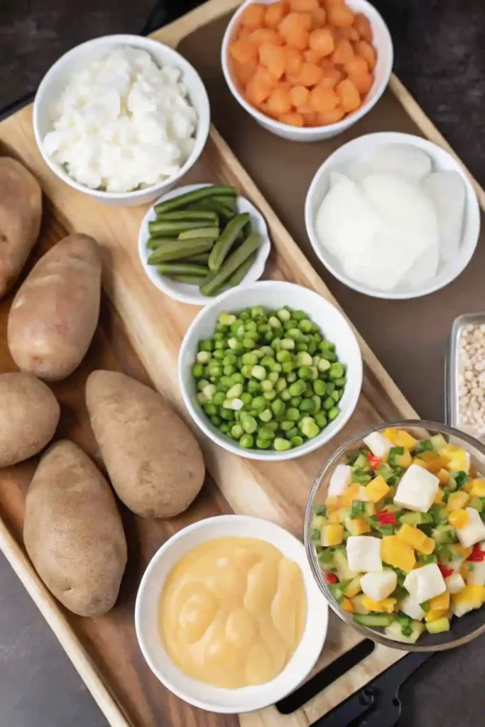 - Add cream of chicken soup, diced potatoes, garlic, and frozen mixed vegetables. Stir gently.