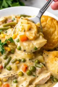 If your biscuits look raw but the pot is done, just pop the slow cooker insert under a broiler (if it fits). Gets ’em golden fast. Give the pot a quick stir halfway through so nothing sticks (sometimes the creamy sauce likes to hug the edges). Taste and adjust salt at the end—you can always add, but you can’t take away! Let it sit, uncovered, five minutes before scooping. It thickens up like a dream and you won’t scald your tongue.
