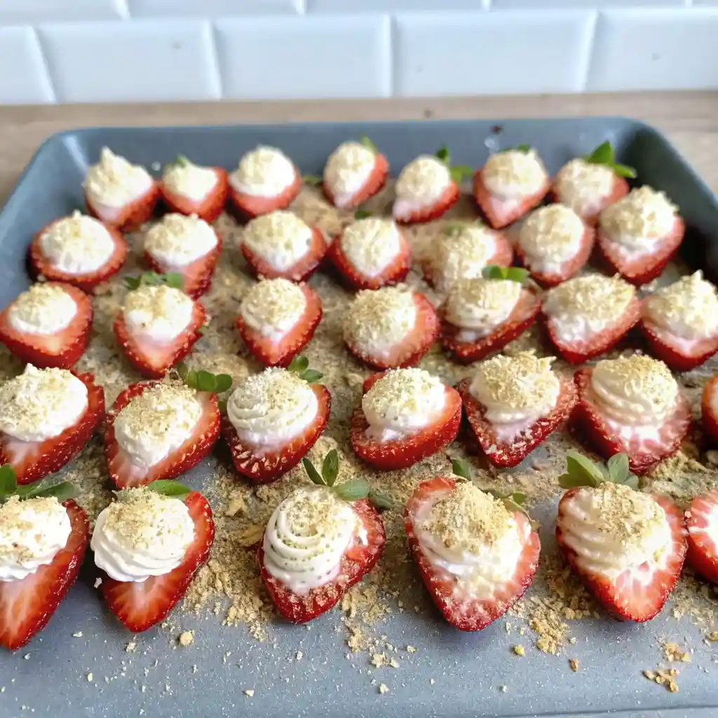 In the world of sophisticated summer entertaining, the most successful desserts are often those that reinvent classic concepts with a whimsical twist. These Deviled Strawberries are a brilliant culinary pun—taking the visual structure of a savory deviled egg and transforming it into a gourmet, no-bake sweet treat. Featuring ruby-red strawberry halves hollowed out and piped with a velvet-smooth cheesecake filling, then topped with a “yolk” of golden graham cracker crumbs, they are a masterclass in texture and presentation.