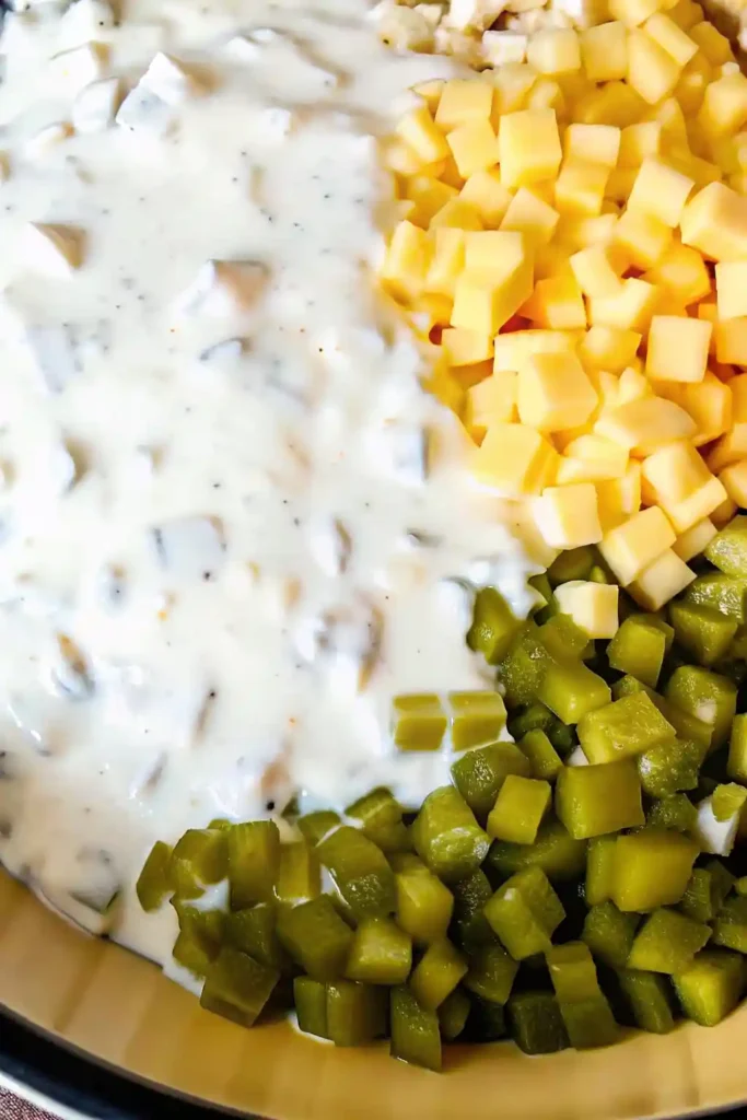 - Pro Tip: Uniformity is the hallmark of a professional salad. You want the pickle bits and cheese cubes to be similar in size to ensure a balanced mouthfeel.