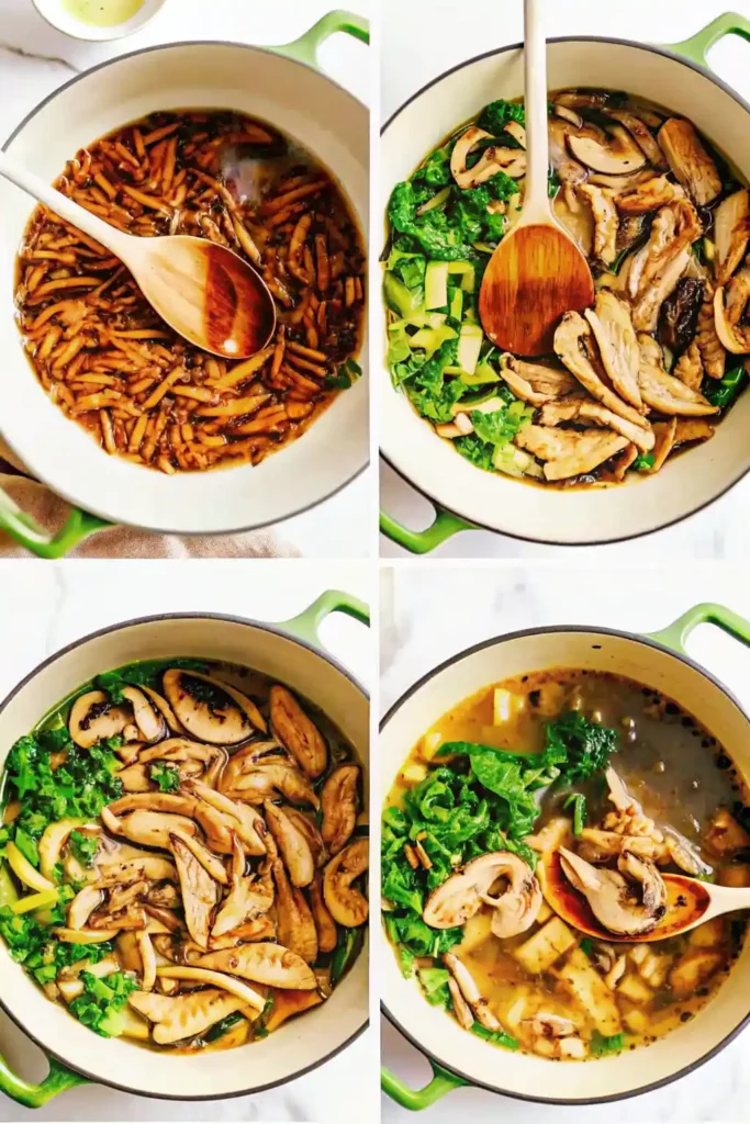 - Sauté Aromatics: Heat the olive oil in a large Dutch oven or pot over medium heat. Add the sliced mushrooms and the white parts of the green onions. Cook, stirring occasionally, until the mushrooms have released their liquid and started to brown, about 5-7 minutes.