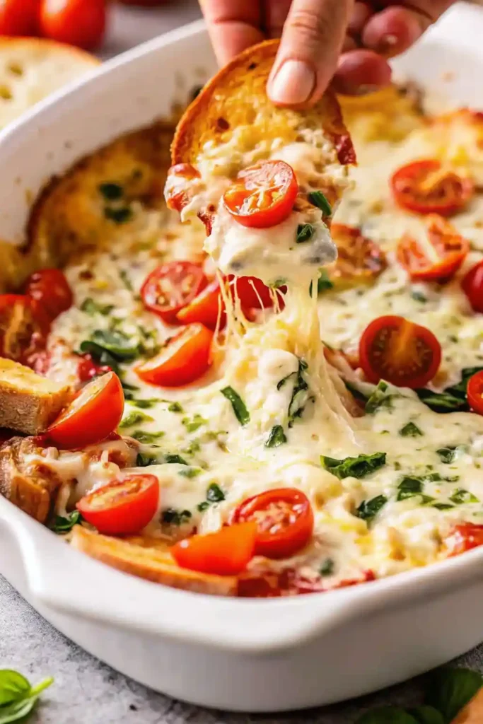 - The “No-Break” Rule: If you bake the dip for too long, the fat in the mozzarella will separate, leaving a puddle of oil on top. Remove the dip the moment the tomatoes burst to maintain a creamy emulsion.