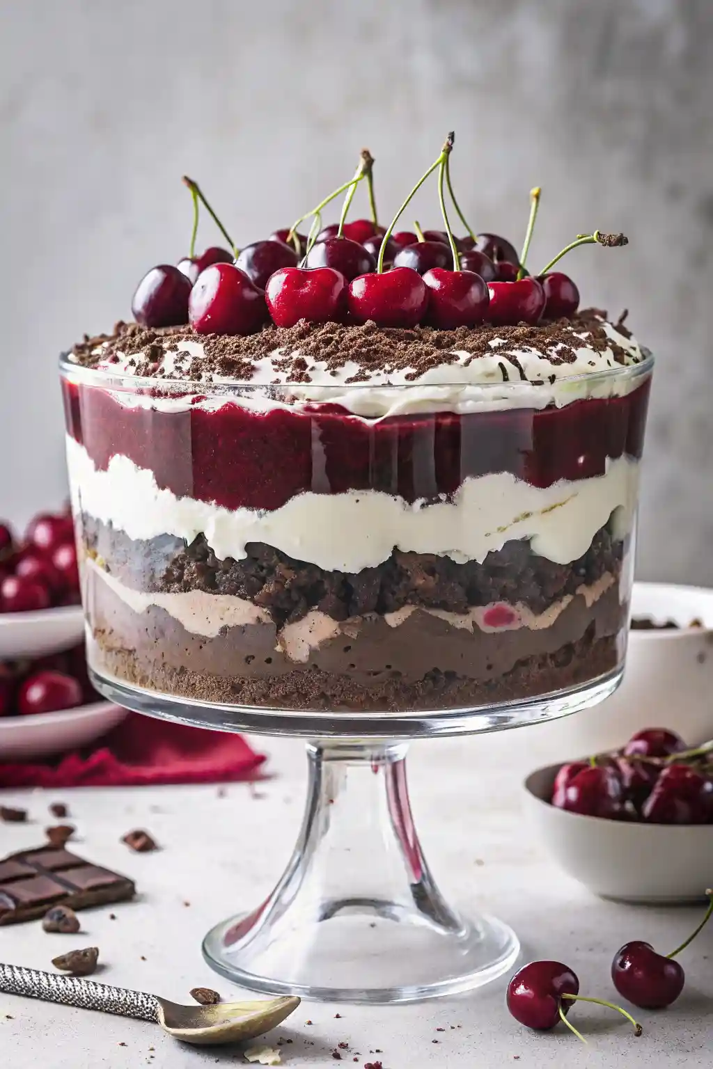 - Garnish: Garnish the top layer of whipped cream with a generous amount of chocolate shavings and a few reserved cherries for decoration.