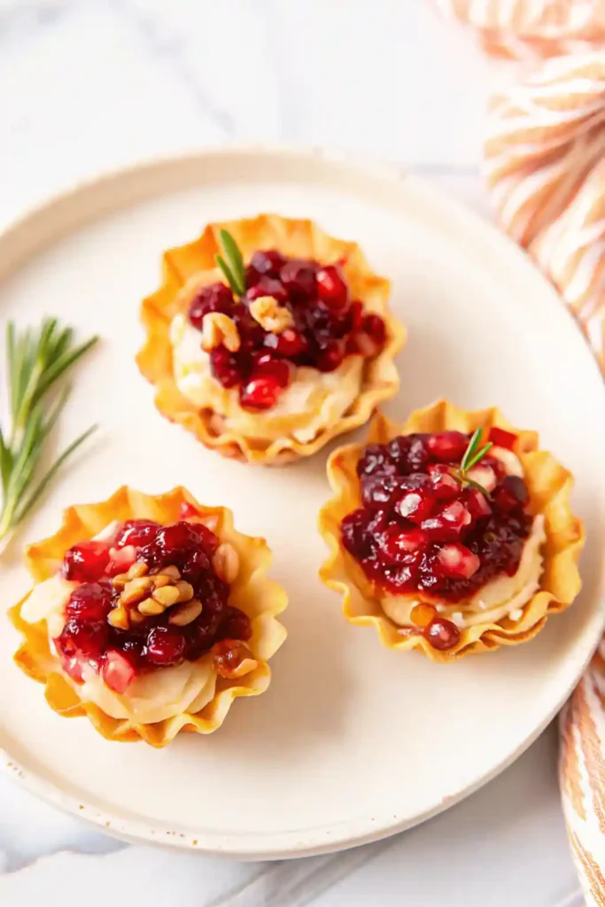 - Pipe whipped brie into each phyllo cup. Top with a spoonful of cranberry sauce.