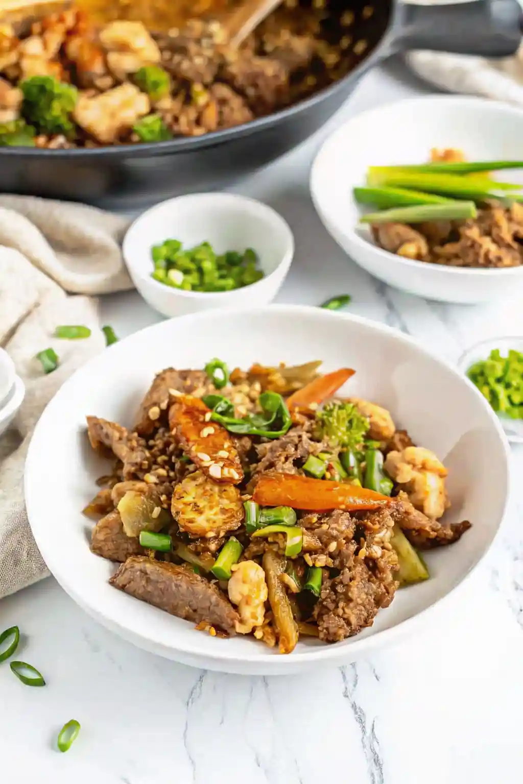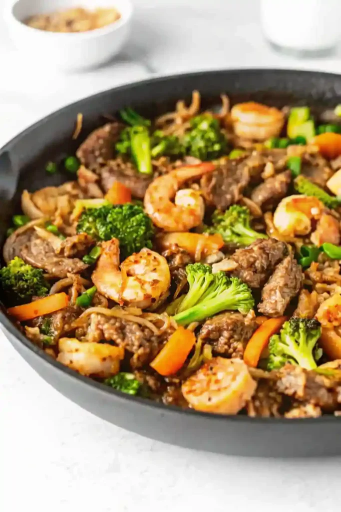 - Return steak and shrimp to the skillet. Toss everything together, top with green onions, and cook for 1–2 minutes until heated through. Garnish with sesame seeds or chili flakes if desired.