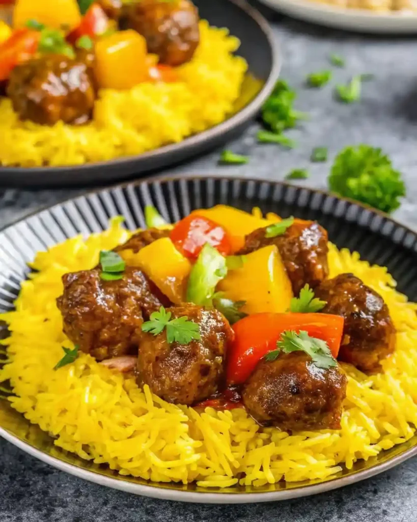 - Serve: Add the baked meatballs to the skillet and gently toss to coat them completely in the sweet and sour sauce. Serve immediately over rice, garnished with sliced green onions or sesame seeds.