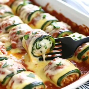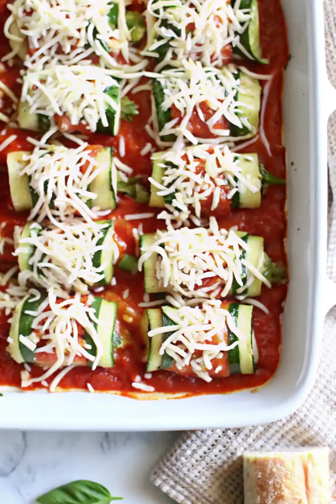 - Preheat your oven to 375°F (190°C). Spread 1 cup of marinara sauce in the bottom of a 9×13-inch baking dish. Take one zucchini plank and spoon about 1.5 tablespoons of ricotta mixture onto one end. Roll the plank tightly and place it seam-side down in the baking dish. Repeat with remaining zucchini planks.