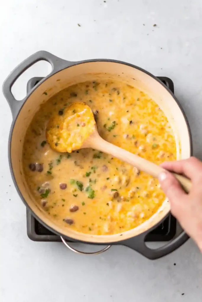 3. Stir in heavy cream and shredded cheese. Let cheese melt fully, then return soup to a gentle simmer.