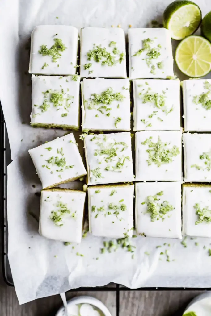 - Use the parchment paper to lift the bars from the pan. Top with fresh whipped cream and extra lime zest. Slice into 16 squares. For the sharpest edges, refrigerate the bars for 20 minutes before slicing.