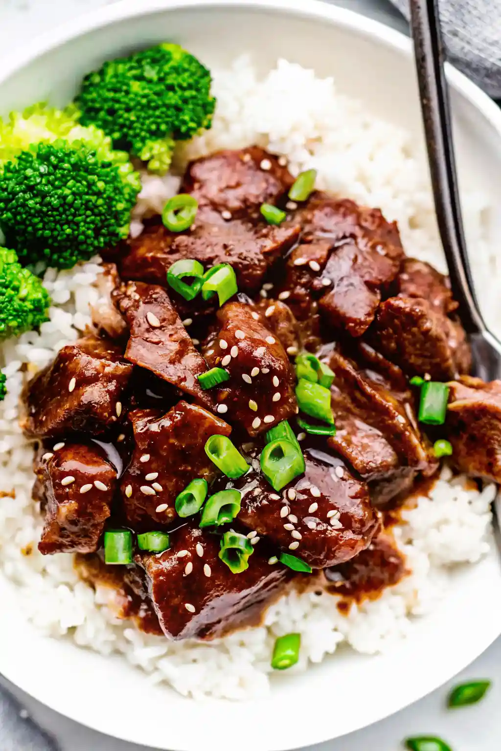Serve the Korean beef over rice, topped with sliced green onions and sesame seeds. Don’t forget to spoon plenty of that delicious sauce over everything!