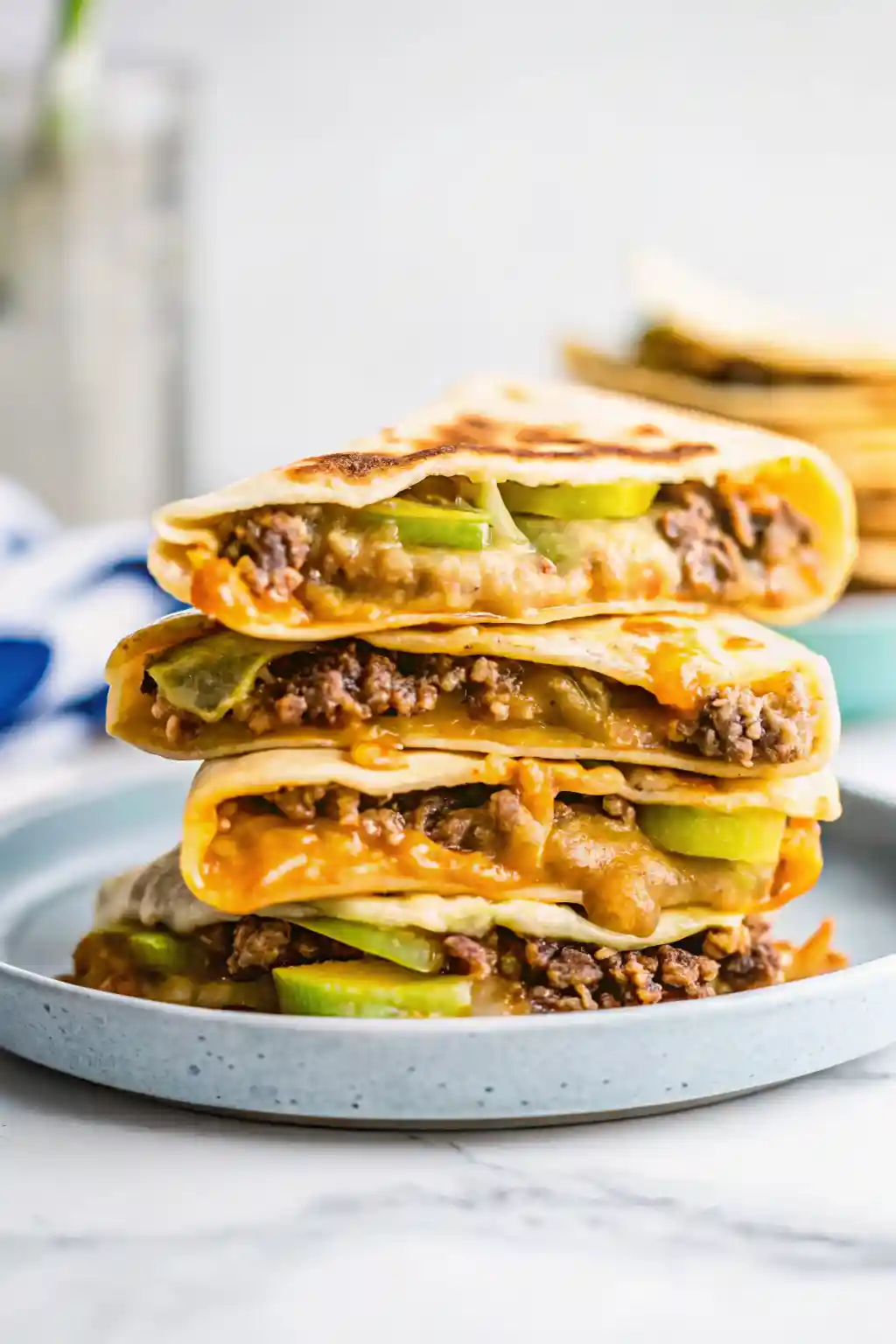 - Wipe out the skillet and spray with nonstick spray. Heat over medium heat. Place one tortilla in the skillet. On one half, layer 1/2 cup cheese, 1/4 of the cooked beef, and pickle slices if using. Sprinkle another 1/2 cup cheese on top and fold the tortilla in half.