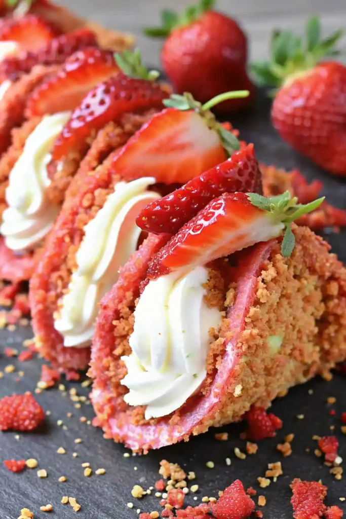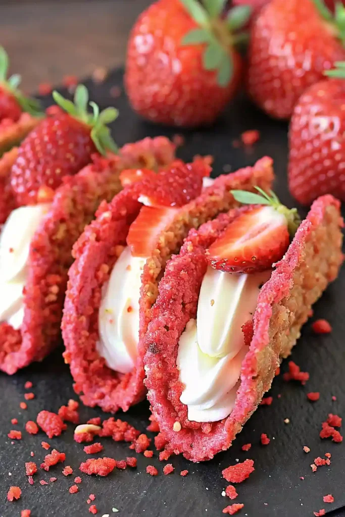 - Coat and Serve: Dip the top edges of the filled tacos into the strawberry crunch topping, pressing gently to adhere. Serve immediately for the best crispy texture.