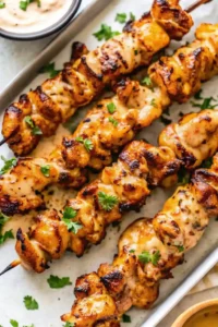 - In a bowl, combine chicken thighs with olive oil, paprika, garlic powder, black pepper, cayenne pepper, and salt. Toss well to coat. Soak wooden skewers for 30 minutes if using.